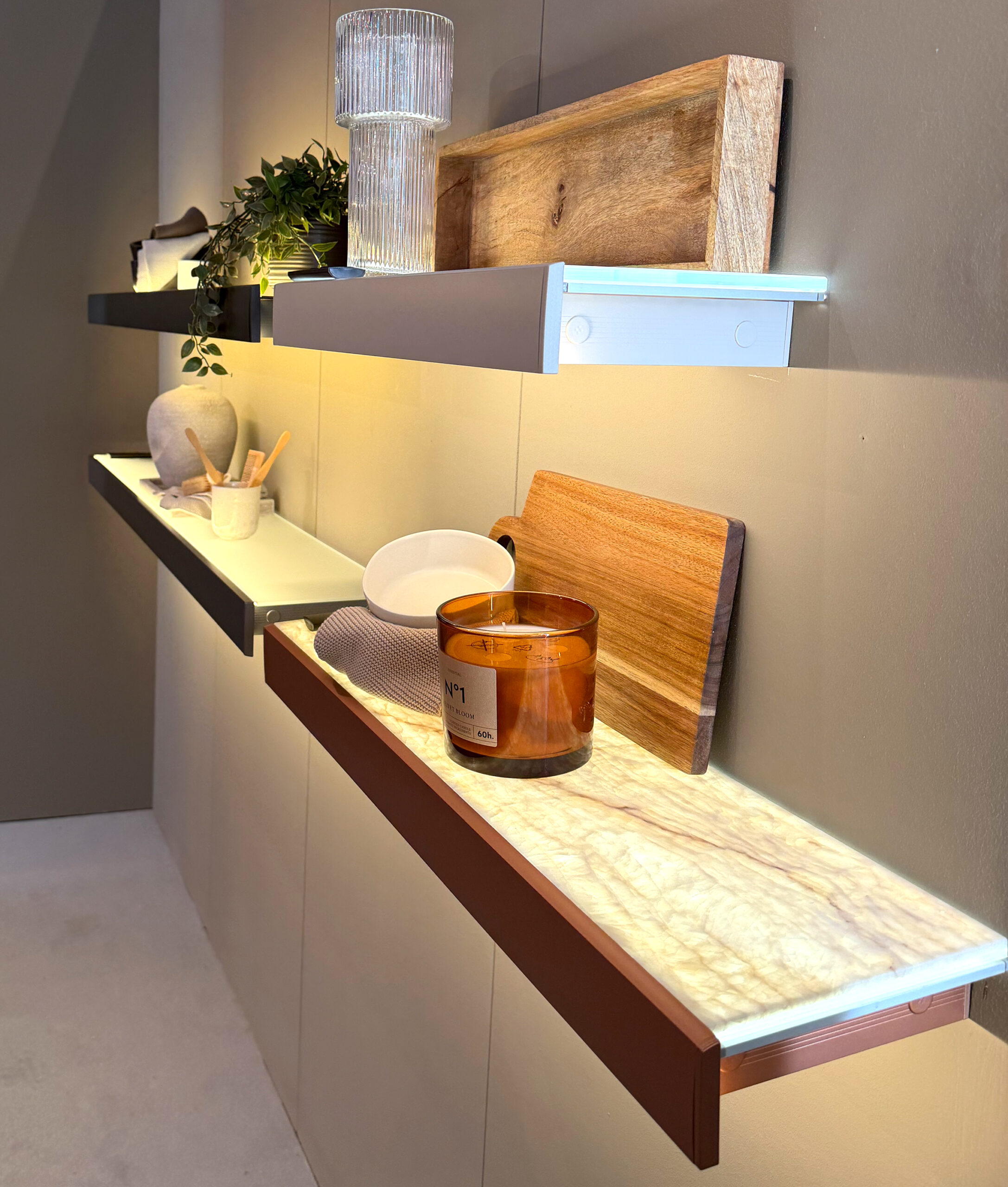 Ob im Bad oder in der Küchennische: Das neue „Lumirack“ bietet nicht nur Ablagefläche über eine vom Kunden definierte Fläche, sondern setzt mit blendfreiem Licht auch verschiedene Materialien und Objekte stilvoll in Szene. Zudem bietet der Regalträger dem Nutzer intelligente Funktionen. Zur SICAM 2025 zeigt die Wessel – Licht für Möbel GmbH mögliche Werkstoff-Konfigurationen. Neben Holz, Glas und Keramik beeindruckt insbesondere die „Stone“-Version, die echten Stein vollflächig durchleuchtet.